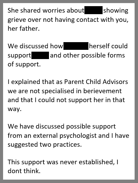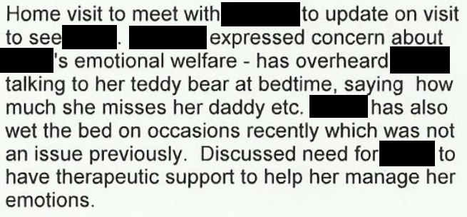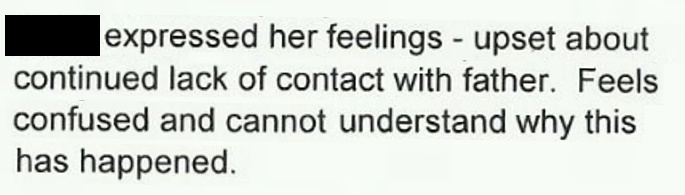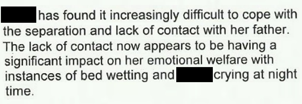 The child's father was asked for his opinion about the situation. He told Pippa Rowe and a social worker that he was protecting the child from the argumentative mother and that he needed help to stop the mother taking the child away from him.